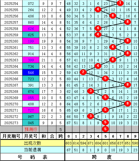 福彩3D第2025273期最大跨度开出5,近期最大跨度波动较大,本期展望最大跨度在3-7区段出现,最大跨度温情34567,精选跨度5。